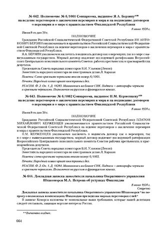 Полномочие .№ 6/1061 Совнаркома, выданное Я.А. Берзину на ведение переговоров о заключении перемирия и мира и на подписание договоров о перемирии и о мире с правительством Финляндской Республики. 8 июня 1920 г. // РГАСПИ. Ф. 2. Оп. 1. Д. 14283. Машинопись.