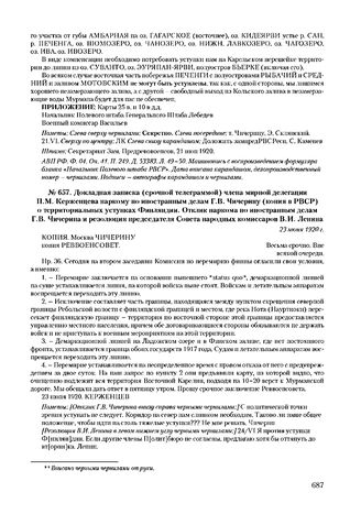 Докладная записка (срочной телеграммой) члена мирной делегации П.М. Керженцева наркому по иностранным делам Г.В. Чичерину (копия в РВСР) о территориальных уступках Финляндии. Отклик наркома по иностранным делам Г.В. Чичерина и резолюция председателя Совета народных комиссаров В.И. Ленина. 23 июня 1920 г. // РГАСПИ. Ф. 2. Оп. 1. Д. 24423. Л. 1. Машинопись. АВП РФ. Ф. 04. Оп. 41. П. 249. Д. 53382. Л. 20. Машинопись. Опубл.: Родина. 2015. № 11. С. 113.