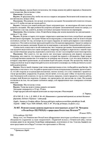 Пояснительная записка наркома по иностранным делам Г.В. Чичерина в Политбюро ЦК РКП(б) о природных богатствах Печенги. 28 июня 1920 г. // РГАСПИ. Ф. 2. Оп. 1. Д. 14512. Л. 1-1 об. Машинопись. АВП РФ. Ф. 04. Д. 53382. Л. 27-27 об. Машинопись.