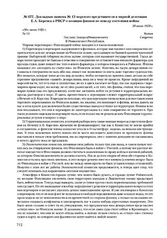 Докладная записка № 13 морского представителя в мирной делегации Е.А. Беренса в РВСР о позиции финнов по поводу состояния войны. 30 июня 1920 г.
