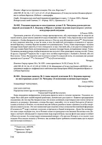 Докладная записка № 5 главы мирной делегации Я.А. Берзина наркому по иностранным делам Г.В. Чичерину об изменении политики переговоров. 3 июля 1920 г. // АВП РФ. Ф. 04. Оп. 41. П. 250. Д. 53387. Л. 10-16. Машинопись. РГАСПИ. Ф. 5. Оп. 1. Д. 2010. Л. 13-19. Машинопись. Опубл.: Россия и Финляндия: от противостояния к миру. 1917-1920 гг. С. 345-350.