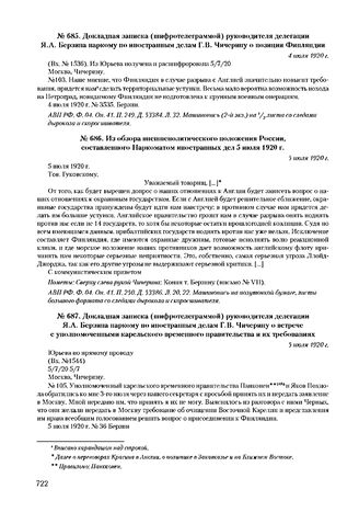 Докладная записка (шифротелеграммой) руководителя делегации Я.А. Берзина наркому по иностранным делам Г.В. Чичерину о встрече с уполномоченными карельского временного правительства и их требованиях. 5 июля 1920 г. // АВП РФ. Ф. 04. Оп. 41. П. 249. Д. 53384. Л. 34. Машинопись.