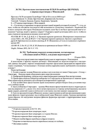 Протокольное постановление П 29/6 Политбюро ЦК РКП(б) о мирных переговорах с Финляндией. 23 июля 1920 г. // РГАСПИ. Ф. 17. Оп. 3. Д. 96 Л. 1-2. Чистовой вариант протокола; Оп. 163. Д. 80. Л. 7-7 об. Черновой вариант протокола. Рукопись; Л. 12. Машинопись. АП РФ. Ф. 3. Оп. 66. Д. 576. Л. 39. Опубл.: Родина. 2015. № 11. С. 115.