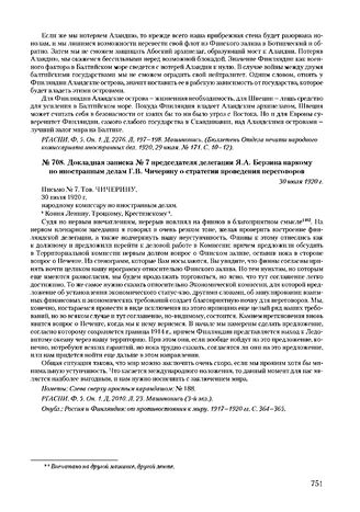Докладная записка № 7 председателя делегации Я.А. Берзина наркому по иностранным делам Г.В. Чичерину о стратегии проведения переговоров. 30 июля 1920 г.