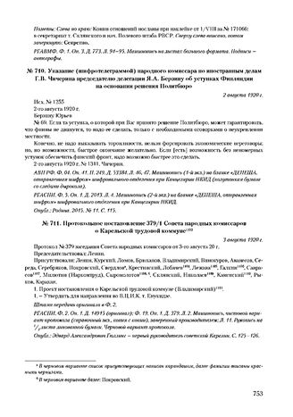 Протокольное постановление 379/1 Совета народных комиссаров о Карельской трудовой коммуне. 3 августа 1920 г. // РГАСПИ. Ф. 2. Оп. 1. Д. 14915 (оригинал): Ф. 19. Оп. 1. Д. 379. Л. 2. Машинопись; Л. 11. Рукопись. Опубл.: Эдвард Александрович Гюллинг - первый руководитель советской Карелии. С. 125-124.