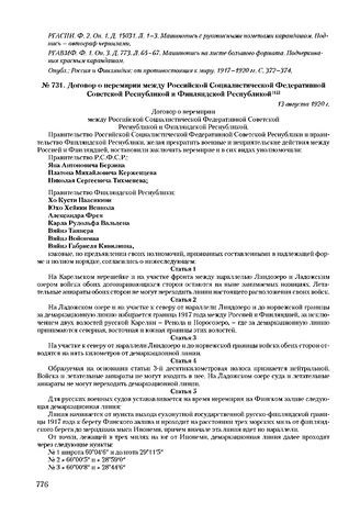 Договор о перемирии между Российской Социалистической Федеративной Советской Республикой и Финляндской Республикой. 13 августа 1920 г. // АВП РФ. Ф. За. Оп. 1. П. 1. Д. 12. Типографский текст. Опубл.: Известия. 1920, 15 августа. № 180. С. 1; ДВП. Т. 3. С. 124-128.
