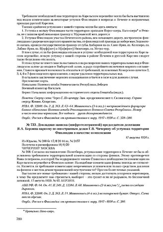 Докладная записка (шифротелеграммой) председателя делегации Я.А. Берзина наркому по иностранным делам Г.В. Чичерину об уступках территории Финляндии в качестве компенсации. 17 августа 1920 г. // АВП РФ. Ф. 04. Оп. 41. П. 249. Д. 53384. Л. 80. Машинопись. РГВА. Ф. 33988. Оп. 2. Д. 283. Л. 71. Машинопись. Опубл.: Россия и Финляндия: от противостояния к миру. 1917-1920 гг. С. 380.