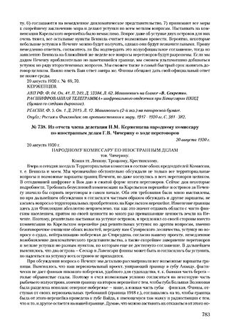 Из отчета члена делегации П.М. Керженцева народному комиссару по иностранным делам Г.В. Чичерину о ходе переговоров. 20 августа 1920 г. // АВП РФ. Ф. 04. Оп. 41. П. 250. Д. 53387. Л. 30-33. Машинопись. РГАСПИ. Ф. 2. Оп. 2. Д. 387. Машинопись.