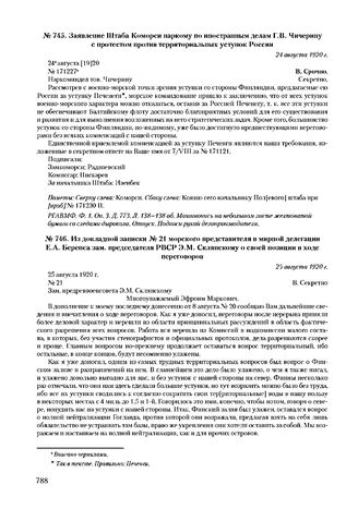 Из докладной записки № 21 морского представителя в мирной делегации Е.А. Беренса зам. председателя РВСР Э.М. Склянскому о своей позиции в ходе переговоров. 25 августа 1920 г. // РГВА. Ф. 33988. Оп. 2. Д. 263. Л. 73-77. Машинопись. Опубл.: Россия и Финляндия: от противостояния к миру. 1917-1920 гг. С. 388-389; Смолин А.В. Новый Брест. С. 331-336.