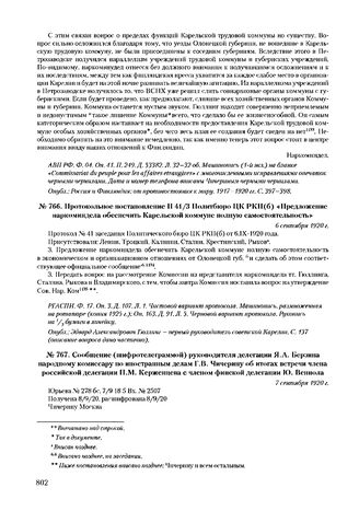 Протокольное постановление П 41/3 Политбюро ЦК РКП(б) «Предложение наркоминдела обеспечить Карельской коммуне полную самостоятельность». 6 сентября 1920 г. // РГАСПИ. Ф. 17. Оп. 3. Д. 107. Л. 1. Чистовой вариант протокола. Машинопись; Оп. 103. Д. 91. Л. 5. Черновой вариант протокола. Pукопись.