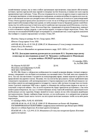 Докладная записка руководителя делегации Я.А. Берзина народному комиссару по иностранным делам Г.В. Чичерину о нейтралитете Финляндии в случае войны с РСФСР третьей страны. 11 сентября 1920 г. // АВП РФ. Ф. 04. Оп. 41. П. 250. Д. 53384. Л. 78. Машинопись. РГАСПИ. Ф. 5. Оп. 1. Д. 2015. Л. 25. Машинопись.