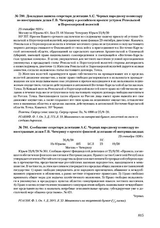 Докладная записка секретаря делегации А.С. Черных народному комиссару по иностранным делам Г.В. Чичерину о российском проекте уступок Ренольской и Поросозерской волостей. 23 сентября 1920 г. // РГАВМФ. Ф. 1. Оп. 3. Д. 773. Л. 59. Машинопись.