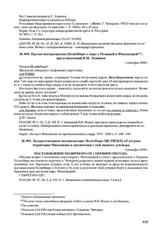 Беспротоколыюе постановление Политбюро ЦК РКП(б) об уступке территории Финляндии и заключении с ней мирного договора. 1 октября 1920 г.