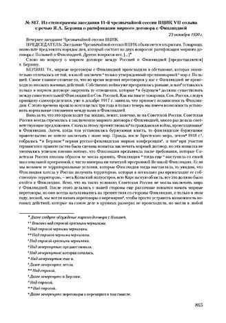 Из стенограммы заседания 11-й чрезвычайной сессии ВЦИК VII созыва с речью Я.А. Берзина о ратификации мирного договора с Финляндией. 23 октября 1920 г. // ГА РФ. Ф. 1235. Оп. 22. Д. 9. Л. 26-39. Черновой вариант стенограммы. Машинопись; Л. 134-147. Речь Берзина - машинопись. Опубл.: Россия и Финляндия; от противостояния к миру. 1917-1920 гг. С. 432-444.
