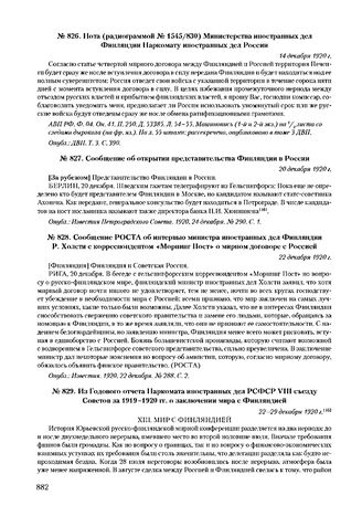 Сообщение об открытии представительства Финляндии в России. 20 декабря 1920 г. // Опубл.: Известия Петроградского Совета. 1920, 24 декабря, № 290. С. 1.