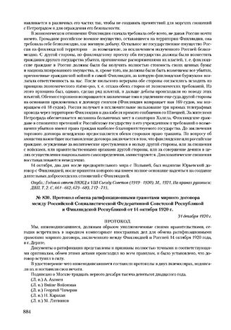 Протокол обмена ратификационными грамотами мирного договора между Российской Социалистической Федеративной Советской Республикой и Финляндской Республикой от 14 октября 1920 г. 31 декабря 1920 г. // АВП РФ. Ф. За, Оп. 1. П. 3. Д. 18. Типографский текст. Опубл.: The Courtesy of the Treaty Section. Office of Legal Affairs, United Nations, New York. Société des nations Recueil des Trades et des Engagements Internationaux enregistrés par le Secrétariat de la Société des Nations. League of Nations. Treaty Series Publication of Treaties and International Engagements Registered with the Secretariat of the League of Nations. Vol, 3. 1921. № 1. P. 79.