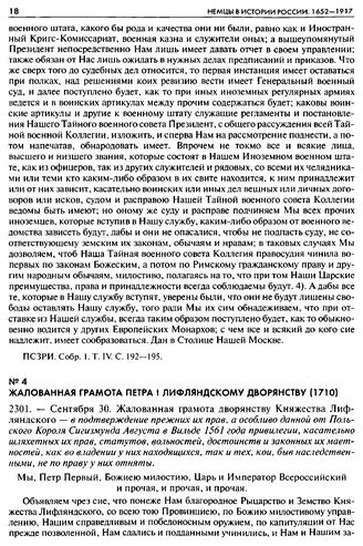Жалованная грамота Петра I Лифляндскому дворянству (1710). 2301. — Сентября 30. Жалованная грамота дворянству Княжества Лифляндского — в подтверждение прежних их прав, а особливо данной от Польского Короля Сигизмунда Августа в Вильде 1561 года при...