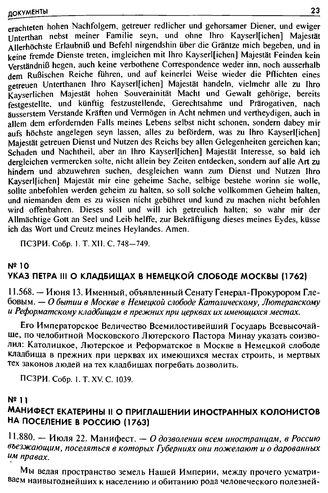 Манифест Екатерины II о приглашении иностранных колонистов на поселение в Россию (1763). 11.880. — Июля 22. Манифест. — О дозволении всем иностранцам, в Россию въезжающим, поселяться в которых Губерниях они пожелают и о дарованных им правах // ПСЗРИ. Собр. 1. Т. XVI. С. 313-316. Опубликовано: История российских немцев в документах (1763—1992 гг.) / Сост.: В.А. Ауман, В.Г. Чеботарева. М. 1993. С. 18—22.