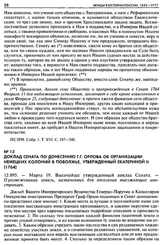 Доклад Сената по донесению Г. Г. Орлова об организации немецких колоний в Поволжье, утвержденный Екатериной II (1764). 12.095. — Марта 19. Высочайше утвержденный доклад Сената. — О размежевании земель, назначенных для поселения выезжающих иностранцев
