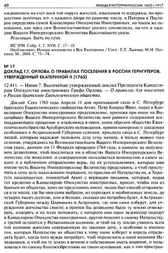 Доклад Г. Г. Орлова о правилах поселения в России гернгутеров, утвержденный Екатериной II (1765). 12.411. — Июня 7. Высочайше утвержденный доклад Президента Канцелярии Опекунства иностранных Графа Орлова. — О правилах для поселения в России братск...