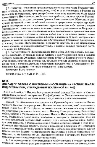 Доклад Г. Г. Орлова о поселении иностранцев на частных землях под Петербургом, утвержденный Екатериной II (1765). 12.503. — Ноября 1. Высочайше утвержденный доклад Президента Канцелярии Опекунства Иностранных Графа Орлова. — О поселении иностранцев в Ингерманландии на частных землях, по условиям с владельцами оных