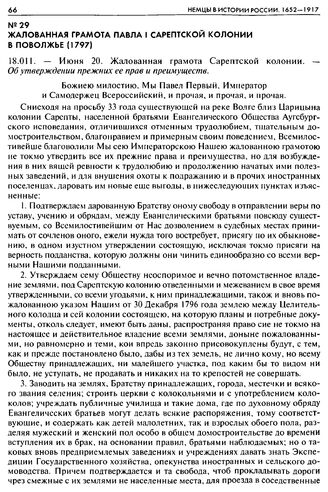 Жалованная грамота Павла I Сарептской колонии в Поволжье (1797). 18.011. — Июня 20. Жалованная грамота Сарептской колонии. — Об утверждении прежних ее прав и преимуществ // ПСЗРИ. Собр. 1. Т. XXIV. С. 671-675. Опубликовано: Сарепта / Сост. И. Р. Плеве. Саратов, 1995. С. 77—82.