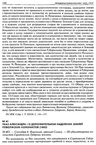 Указ Александра I о дополнительном наделении землей Поволжских колонистов (1802). 20.403. — Сентября 4. Именный, данный Сенату. — Об удовлетворении колонистов Саратовской Губернии землями // ПСЗРИ. Собр. 1. Т. XXVII. С. 240.