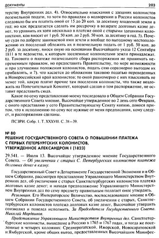 Решение Государственного Совета о повышении платежа с первых Петербургских колонистов, утвержденное Александром I (1823). 29.541. — Июля 13. Высочайше утвержденное мнение Государственного Совета. — Об увеличении с старых С. Петербургских колонистов платежа долговых денег в казну // ПСЗРИ. Собр. 1. Т. XXXVIII. С. 1103-1105.