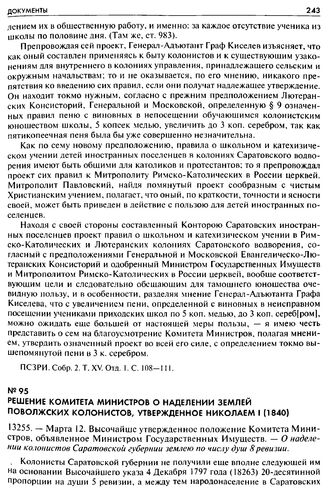 Решение Комитета Министров о наделении землей Поволжских колонистов, утвержденное Николаем I (1840). 13255. — Марта 12. Высочайше утвержденное положение Комитета Министров, объявленное Министром Государственных Имуществ. — О наделении колонистов Саратовской губернии землею по числу душ 8 ревизии // ПСЗРИ. Собр. 2. Т. XV. Отд. 1. С. 138-140.