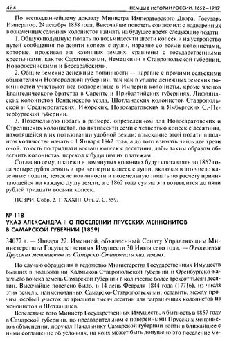 Указ Александра II о поселении Прусских Меннонитов в Самарской губернии (1859). 34077 а. — Января 22. Именной, объявленный Сенату Управляющим Министерством Государственных Имуществ 30 Июля сего года. — О поселении Прусских менонистов на Самарско-Ставропольских землях // ПСЗРИ. Собр. 2. T. XXXIV. Отд. 3. Доп. С. 3-5.