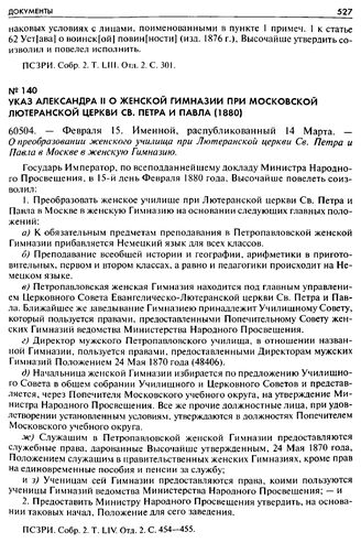 Указ Александра II о женской гимназии при Московской Лютеранской церкви св. Петра и Павла (1880). 60504. — Февраля 15. Именной, распубликованный 14 Марта. — О преобразовании женского училища при Лютеранской церкви Св. Петра и Павла в Москве в женскую Гимназию // ПСЗРИ. Собр. 2. T. LIV. Отд. 2. С . 454-455.