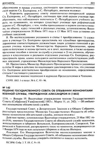 Решение Государственного Совета об отбывании меннонитами военной службы, утвержденное Александром III (1883). 1316. — Января 19. Высочайше утвержденное мнение Государственного Совета (Собр[ание] Узак[онений] 1883 г. Марта 11, ст. 242). — Об отбывании менонитами обязательной службы // ПСЗРИ. Собр. 2. T. III. С. 9-10.