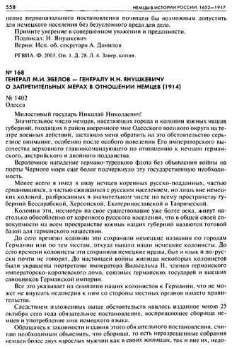 Генерал М. И. Эбелов - генералу Н. Н. Янушкевичу о запретительных мерах в отношении немцев (26 ноября 1914) № 1402, Одесса