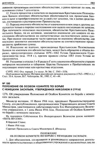 Положение об Особом Комитете по борьбе с немецким засильем, утвержденное Николаем II (1916). 1278. Об утверждении Положения об Особом Комитете по борьбе с немецким засильем // СУРП. 1916. Отд. первый. № 156. С. 1511—1513. Опубликовано частично: История российских немцев в документах ( 1763—1992 гг.). / Сост.: В. А. Ауман, В. Г. Чеботарева. М. 1993. С. 45—46.