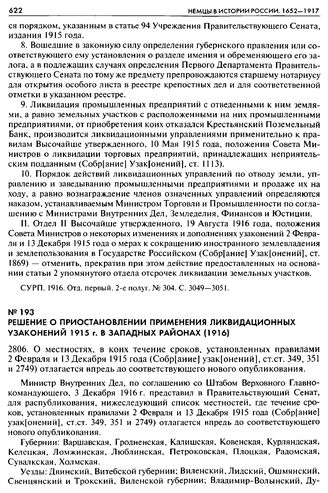 Решение о приостановлении применения ликвидационных узаконений 1915 г. в западных районах (1916). 2806. О местностях, в коих течение сроков, установленных правилами 2 Февраля и 13 Декабря 1915 года (Собр[ание] узак[онений], ст.ст. 349, 351 и 2749) отлагается впредь до соответствующего нового опубликования // СУРП. 1916. Отд. первый. 2-е полуг. № 356. С. 3841.