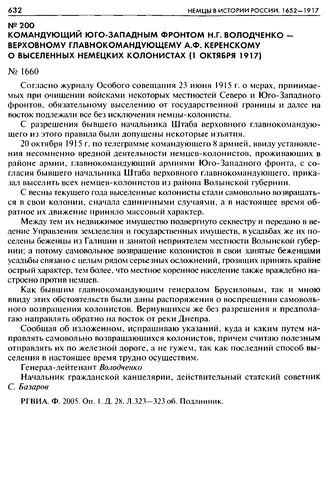 Командующий Юго-Западным фронтом Н. Г. Володченко - Верховному главнокомандующему А. Ф. Керенскому о выселенных немецких колонистах (1 октября 1917). № 1660