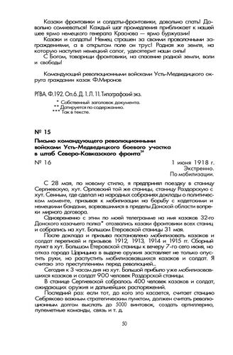 Письмо командующего революционными войсками Усть-Медведицкого боевого участка в штаб Северо-Кавказского фронта. 1 июня 1918 г. // РГВА. Ф. 1304. Оп. 1. Д. 483. Л. 86—87. Автограф; Там же. Л. 84, 84 об.; ГАРО. Ф. Р-4071. Оп. 2. Д. 10. Л. 21, 21 об. Машинописные копии, заверенные подписью начальника штаба Северо-Кавказского фронта Федорова и печатью.