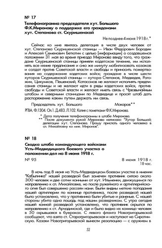 Телефонограмма председателя хут. Большого Ф.К. Миронову о поддержке его гражданами хут. Степанова ст. Скуришенской. Не позднее 4 июня 1918 г. // РГВА. Ф. 1304. Оп. 1. Д. 483. Л. 102. Копия с пометками Ф.К. Миронова.