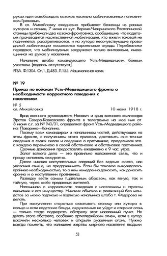 Приказ по войскам Усть-Медведицкого фронта о необходимости корректного поведения с населением. Сл. Михайловка, 10 июня 1918 г. // РГВА. Ф. 1304. Оп. 1. Д. 488. Л. 163. Машинописная копия.