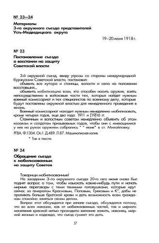 Материалы 3-го окружного съезда представителей Усть-Медведицкого округа. Обращение съезда к мобилизованным на защиту Советов. 20 июня 1918 г.