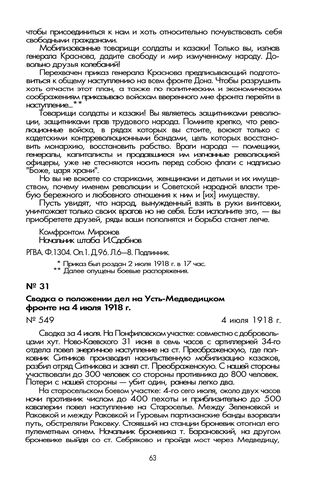 Сводка о положении дел на Усть-Медведицком фронте на 4 июля 1918 г. 4 июля 1918 г. // РГВА. Ф. 1304. Оп. 1. Д. 484. Л. 156, 156 об. Машинописная копия.