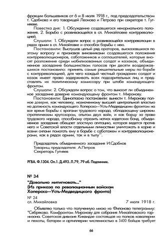 «Довольно митигновать...» (Из приказа по революционным войскам Хоперско—Усть-Медведицкого фронта). Сл. Михайловка, 7 июля 1918 г. // РГВА. Ф. 1304. Оп. 1. Д. 96. Л. 12. Заверенная копия.