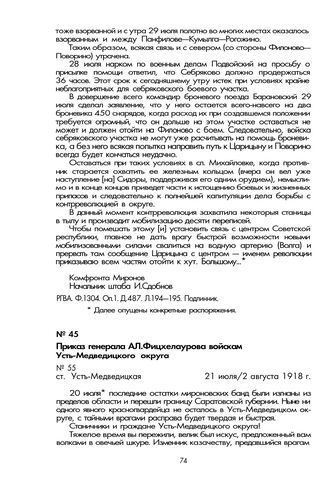 Приказ генерала А.П. Фицхелаурова войскам Усть-Медведицкого округа. Ст. Усть-Медведицкая, 21 июля/2 августа 1918 г. // ЦА ФСБ РФ. С/д Н-217. Т. 8. С. 253. Копия.