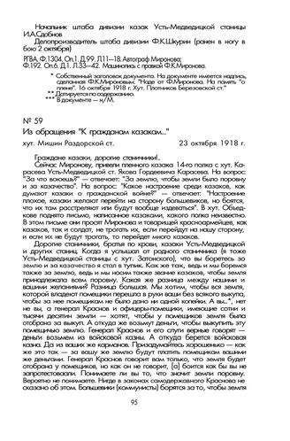 Обращение командования 23-й стрелковой дивизии к казакам. Из обращения «К гражданам казакам...». Хут. Мишин Раздорской ст., 23 октября 1918 г. // РГВА. Ф. 1304. Оп. 1. Д. 495. Л. 34, 35. Машинописный экз.