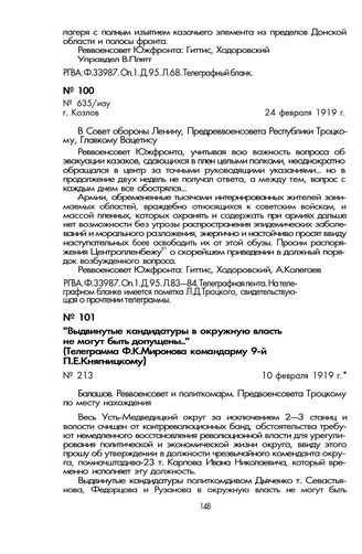 «Выдвинутые кандидатуры в окружную власть не могут быть допущены..» (Телеграмма Ф.К. Миронова командарму 9-й П.Е. Княгницкому). 10 февраля 1919 г. // РГВА. Ф. 192. Оп. 2. Д. 4. Л. 29—30. Телеграфный бланк.