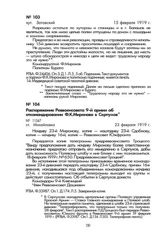 Письмо-прошение от группы казаков, перешедших на сторону Красной Армии и решение Ф.К. Миронова. Хут. Зотовский, 15 февраля 1919 г.