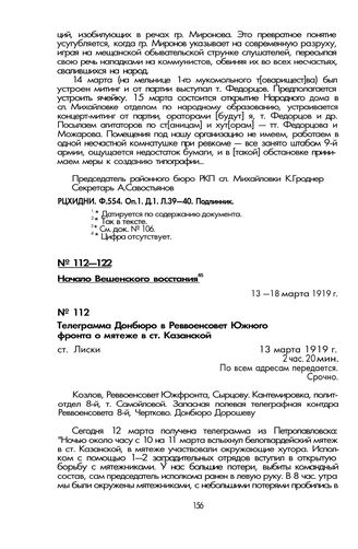 Телеграмма Донбюро в Реввоенсовет Южного фронта о мятеже в ст. Казанской. Ст. Лиски, 13 марта 1919 г.