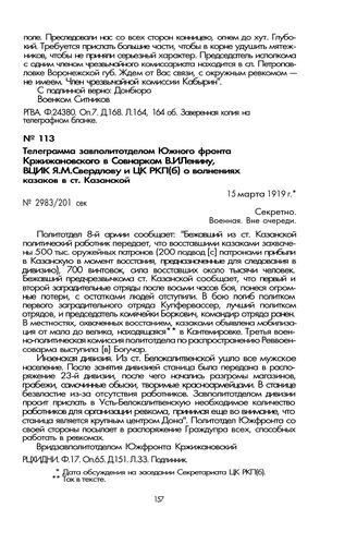Телеграмма завполитотделом Южного фронта Кржижановского в Совнарком В.И. Ленину, ВЦИК Я.М. Свердлову и ЦК РКП(б) о волнениях казаков в ст. Казанской. 15 марта 1919 г. // РЦХИДНИ. Ф. 17. Оп. 65. Д. 151. Л. 33. Подлинник.