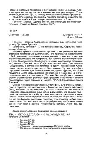 Переговоры по прямому проводу члена Реввоенсовета Южного фронта И.И. Ходоровского с Полевым штабом. Серпухов—Козлов, 22 марта 1919 г. // РГВА. Ф. 33987. Оп. 2. Д. 70. Л. 429—430; Ф. 6. Оп. 10. Д. 14. Л. 92—95. Телеграфные бланки.