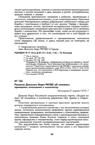 Решение Донского бюро РКП(б) об основных принципах отношения к казачеству. Не позднее 21 апреля 1919 г. // РЦХИДНИ. Ф. 17. ОП. 65. Д. 34. Л. 163—164. Машинописный экз.